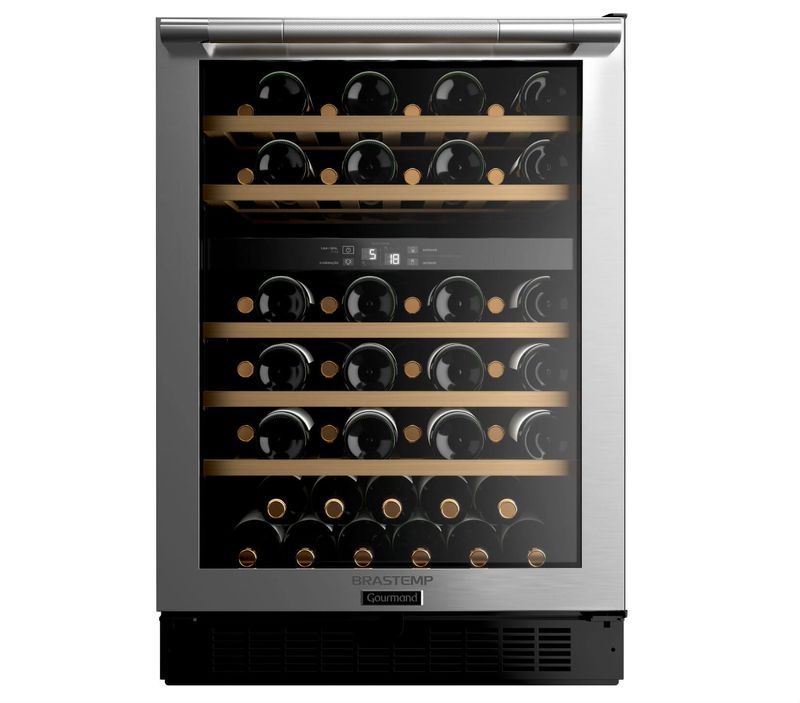 A Adega Brastemp Gourmand Dual Zone 51 Garrafas é perfeita para quem busca armazenar vinhos em casa com qualidade profissional, Com capacidade para 51 garrafas, conta com controle de temperatura dual zone, que permite conservar tintos, brancos e espumantes em suas condições ideais, O design em inox com vidro temperado agrega sofisticação e garante visibilidade das garrafas, enquanto o painel digital touch oferece praticidade e precisão no ajuste da temperatura, Combinando tecnologia, estilo e cuidado especializado, a adega Brastemp proporciona a experiência completa que os amantes do vinho procuram,