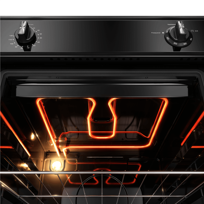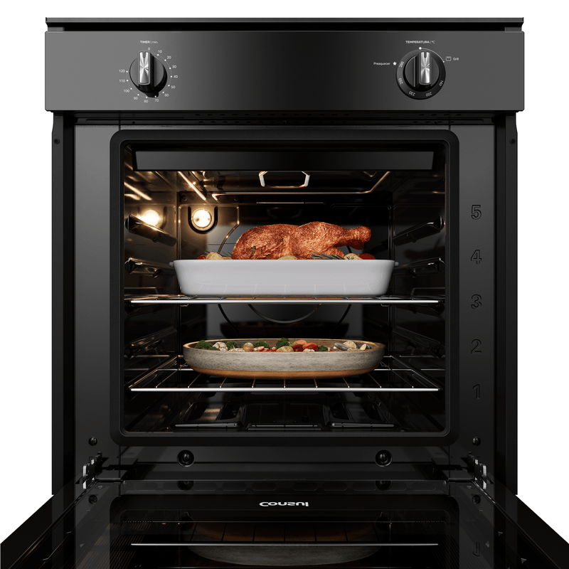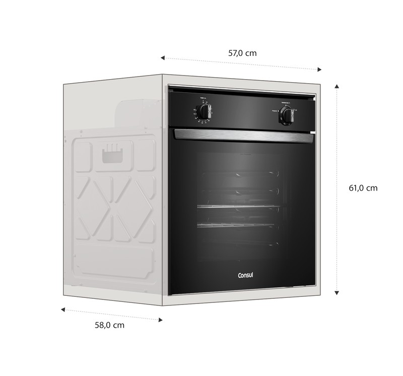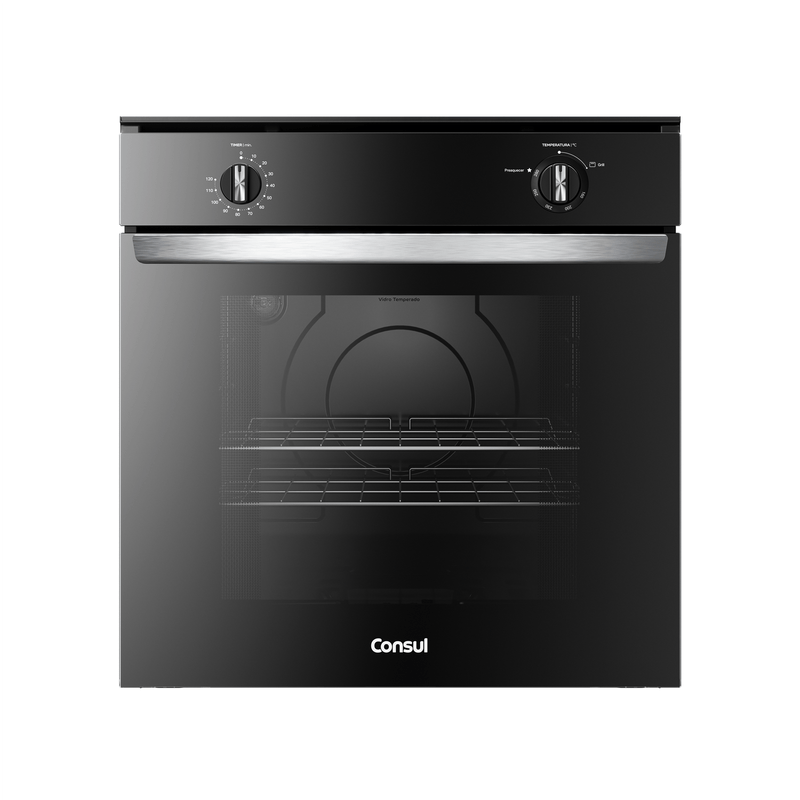Forno de Embutir 78 litros a Gás possui Timer Sonoro, que avisa o final do tempo programado, Seu design moderno em preto com acabamentos metálicos e revestimento esmaltado facilita a limpeza, Com 2 prateleiras ajustáveis em 5 alturas, oferece flexibilidade, e o Grill garante receitas crocantes e irresistíveis, Ideal para quem busca praticidade e eficiência em um forno de embutir, Forno de Embutir Consul é seu forno ideal,