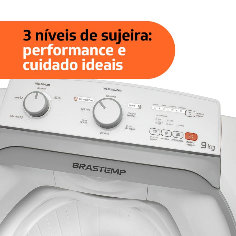 Lavadora Brastemp 9Kg, cuidado essencial para suas roupas, O Ciclo Tira Manchas melhora a eficiência de limpeza das roupas encardidas, deixando suas roupas mais limpas, Com três opções de nível de sujeira, garante uma lavagem com performance de acordo com a agitação das peças,