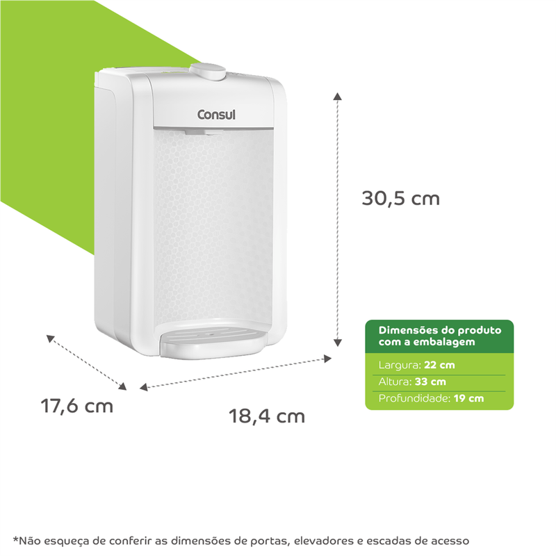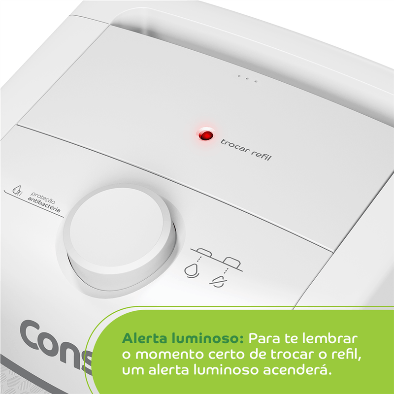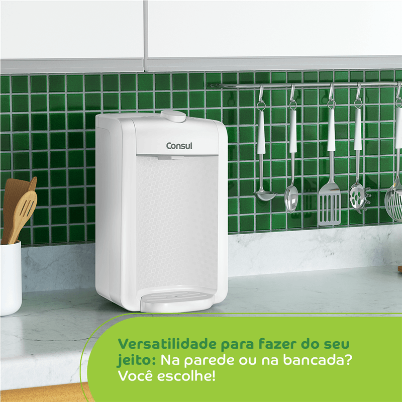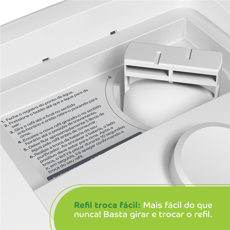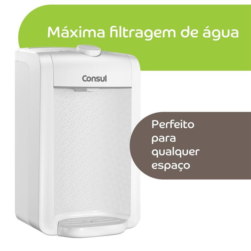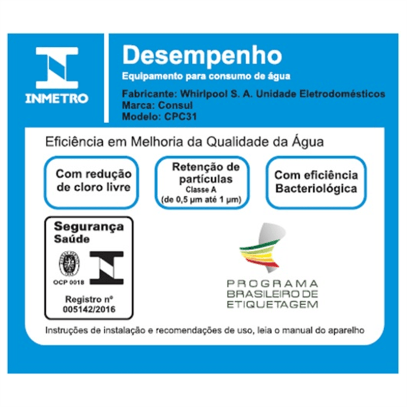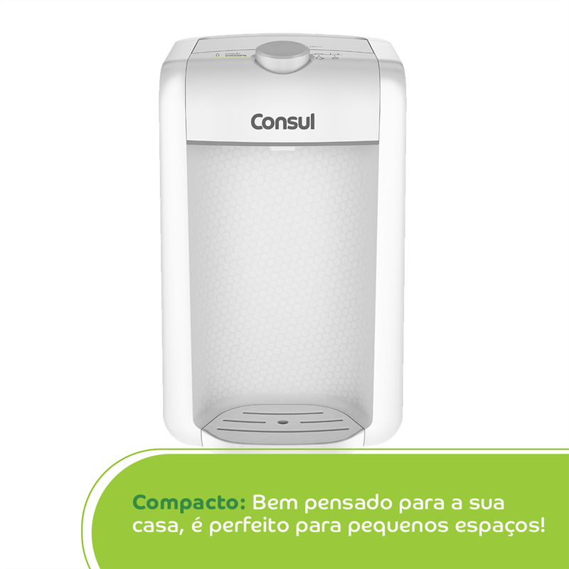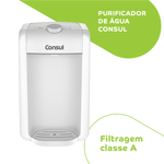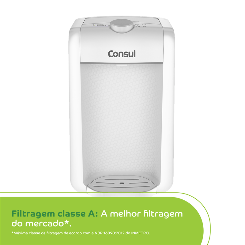 O purificador de água Consul CPC31AB tem design compacto, cabendo em qualquer cantinho da sua cozinha, Vem com o refil original Consul que deixa sua água limpa e saudável, Possui filtragem classe A, que é considerada a melhor filtragem do mercado pelo INMETRO, retendo partículas até 60x menores que um grão de areia, deixando sua água mais limpa, Seu refil original também conta com eficiência bacteriológica que retém 99% das bactérias, como por exemplo, a E, Coli, que causa doenças gastrointestinais, Ainda conta com o alerta luminoso que acenderá quando a vida útil do refil terminar, te informando sempre o momento certo para realizar a troca para você continuar bebendo uma água de qualidade, Para trocar o refil é simples, basta girar e trocar por um novo refil,