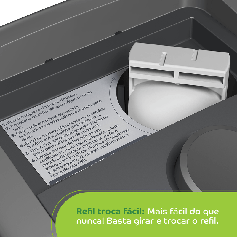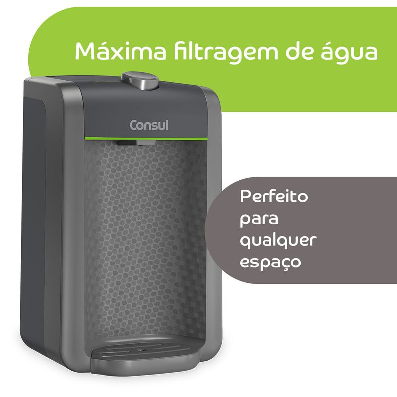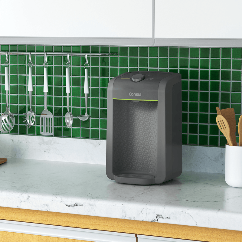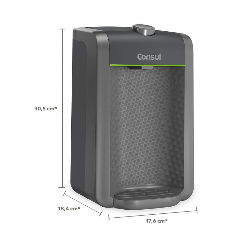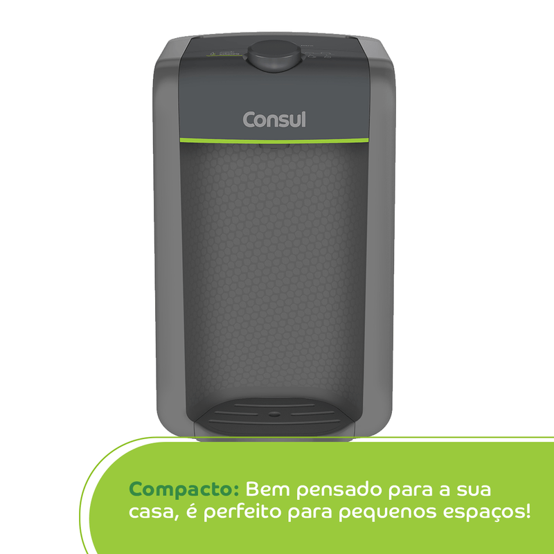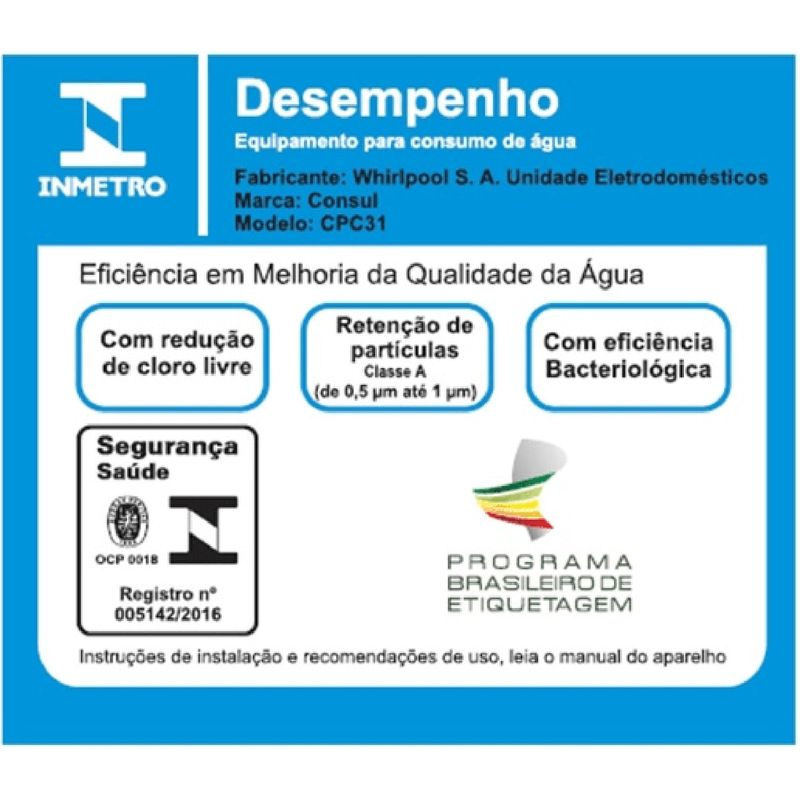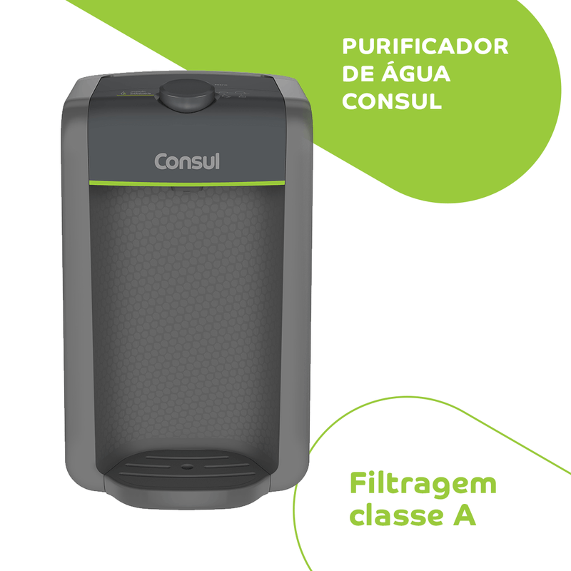 O purificador de água Consul CPC31AF tem design compacto, cabendo em qualquer cantinho da sua cozinha. Vem com o refil original Consul que deixa sua água limpa e saudável. Possui filtragem classe A, que é considerada a melhor filtragem do mercado pelo INMETRO, retendo partículas até 60x menores que um grão de areia, deixando sua água mais limpa. Seu refil original também conta com eficiência bacteriológica que retém 99% das bactérias, como por exemplo, a E. Coli, que causa doenças gastrointestinais. Ainda conta com o alerta luminoso que acenderá quando a vida útil do refil terminar, te informando sempre o momento certo para realizar a troca para você continuar bebendo uma água de qualidade. Para trocar o refil é simples, basta girar e trocar por um novo refil.